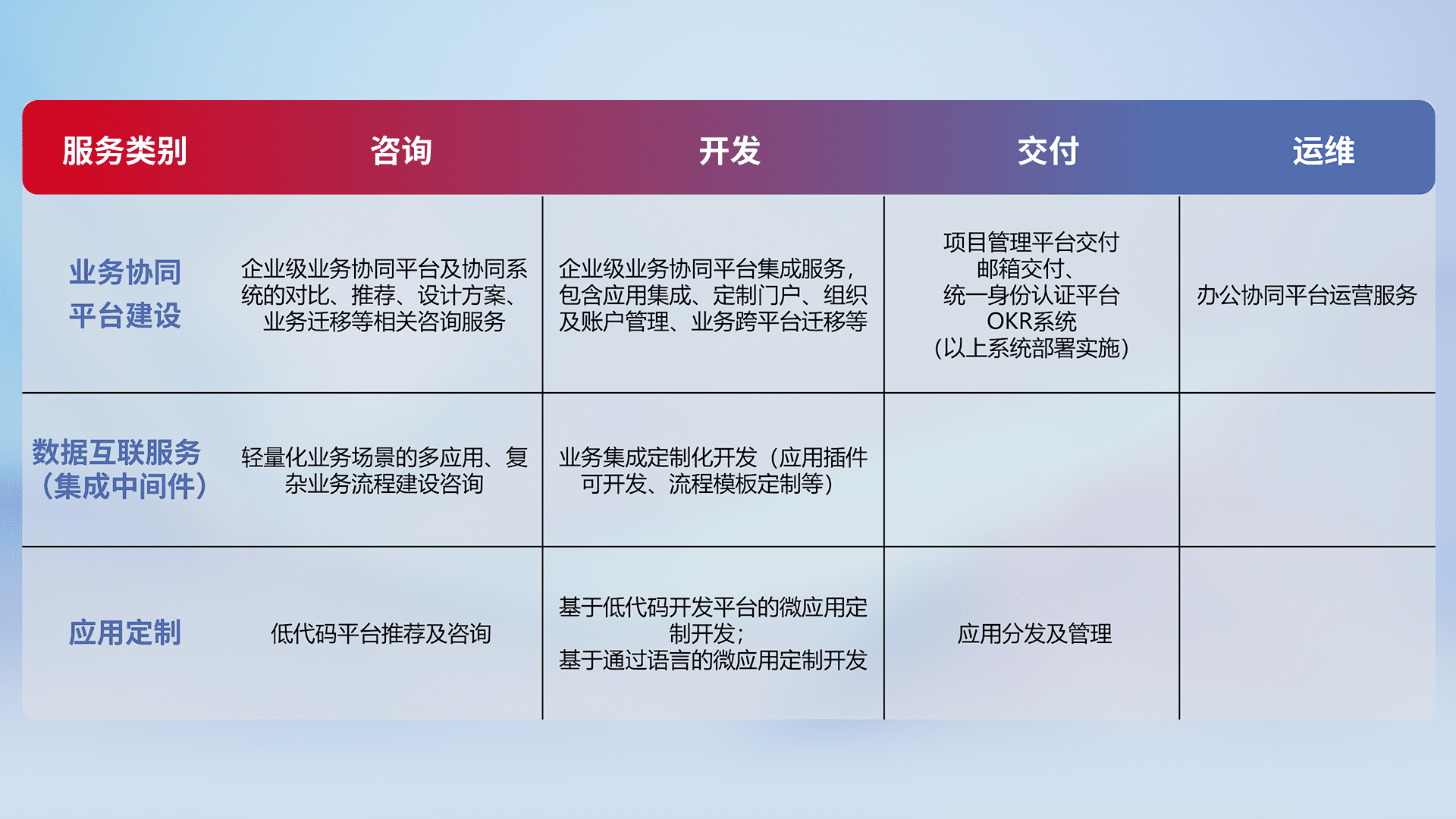 针对钉钉、、、、企微、、IDaas等平台级产品提供产品的规划、、方案、、、、交付、、、、定制化开发等服务,,实现如统一协同办公、、、智能客户服务、、、、混合会议管理、、、智能数据查询、、、等业务场景,,,实现数字化转型。。